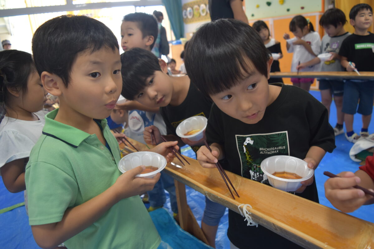 長い竹の川を流れてくるそうめんを上手にお箸でキャッチ!「とれた!」「あっ流れちゃった~」と元気な声が響き渡り、笑顔がいっぱいの子どもたち。みかんやパイナップルも流れてきて子どもたちは大喜び。「もっと流して~」という声も。季節を感じながらみんなで食べる流しそうめんは本当に楽しそうでした。