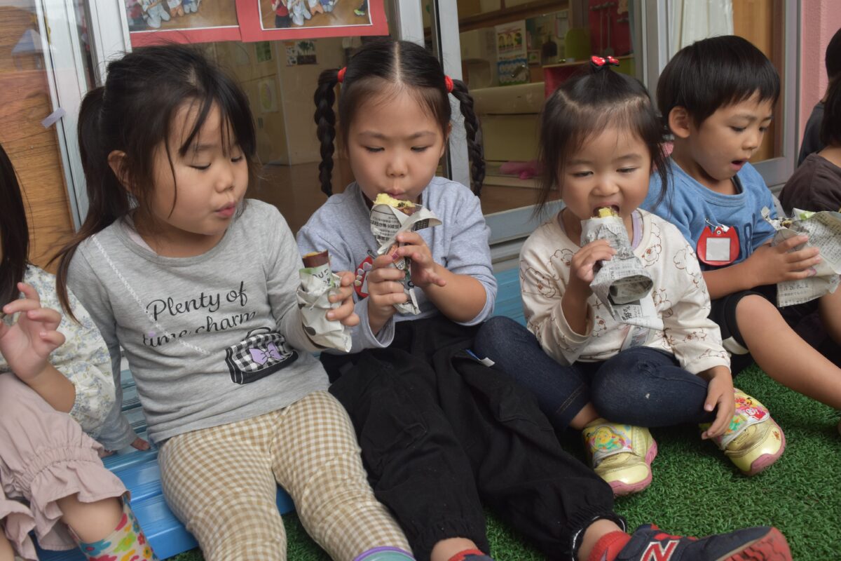 幼児組の子ども達がコバファームで掘ったさつまいもを使い焼き芋をしました。当日は小さいお友達も大きいお友達も上手にさつまいもを新聞紙やアルミホイルで包み、園庭の火の中に投げ込み「美味しく焼けますように」とみんなでお願いしました。焼き上がるとみんな熱がりながらも「美味しい~!」とホクホクの焼き芋を食べていましたよ。